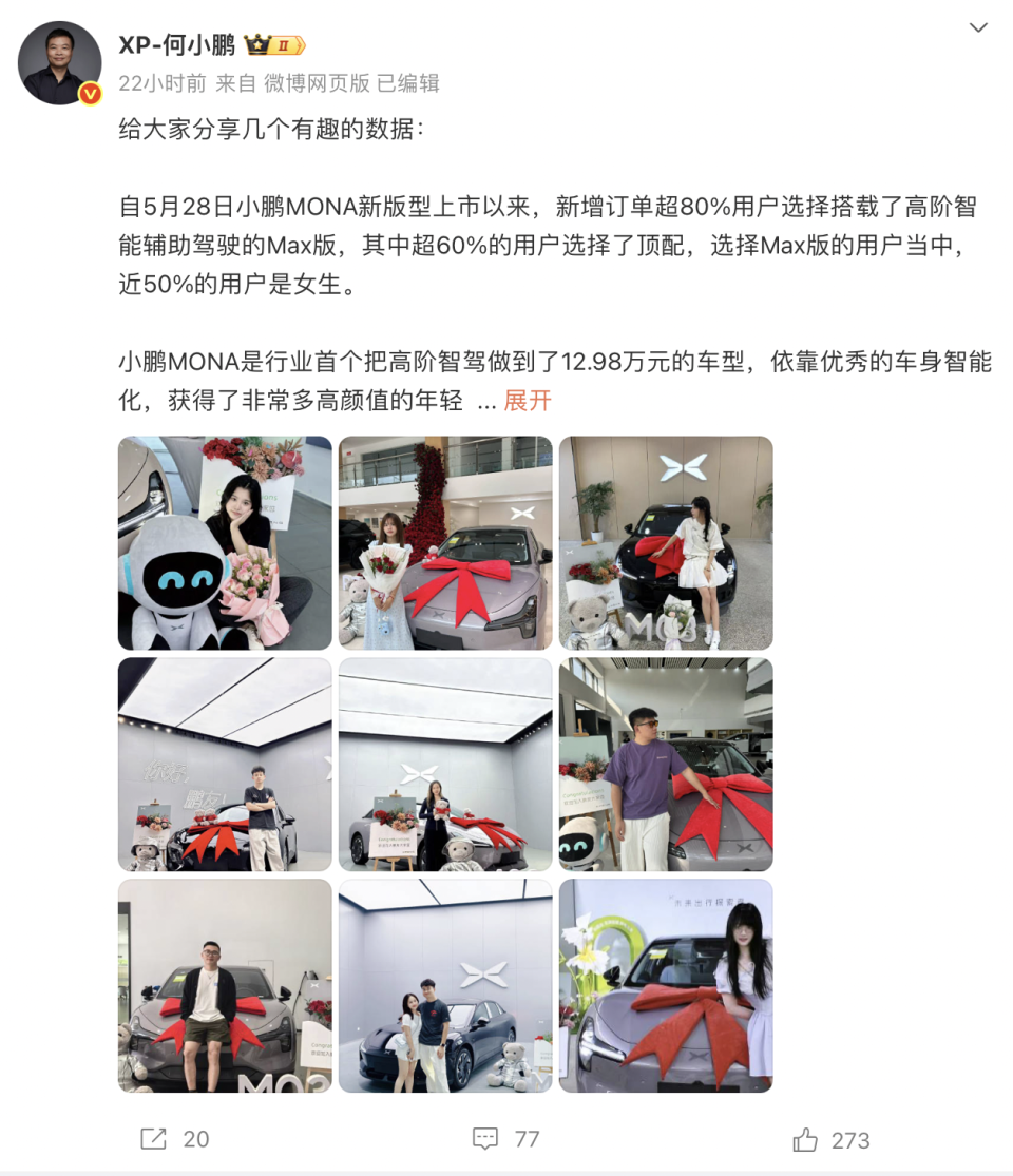 这似乎一下点燃了消费者的激情。小鹏汽车微博内容显示,“其中Max版订单占比83%!”在这里,我们对于小鹏MONA M03的成功表示祝贺。笔者今天不想聊MONA M03爆款的原因,因为15万元的价格,满血高阶智驾辅助,再加上这款车自从去年上市以来的超高人气,这些大家都知道。